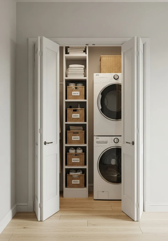 A classic solution for apartments or hallways. A shallow closet can be transformed into a functional laundry station. Bi-fold doors are a great space-saving choice as they don’t swing out and block the entire hallway, and they allow for full, easy access to the entire closet at once.