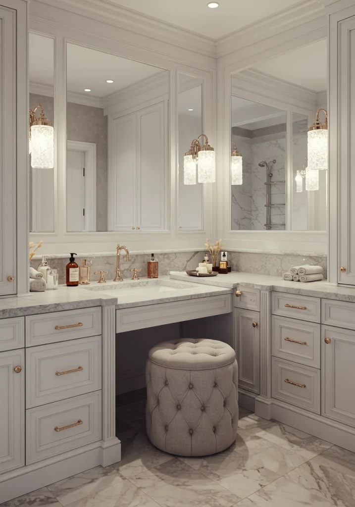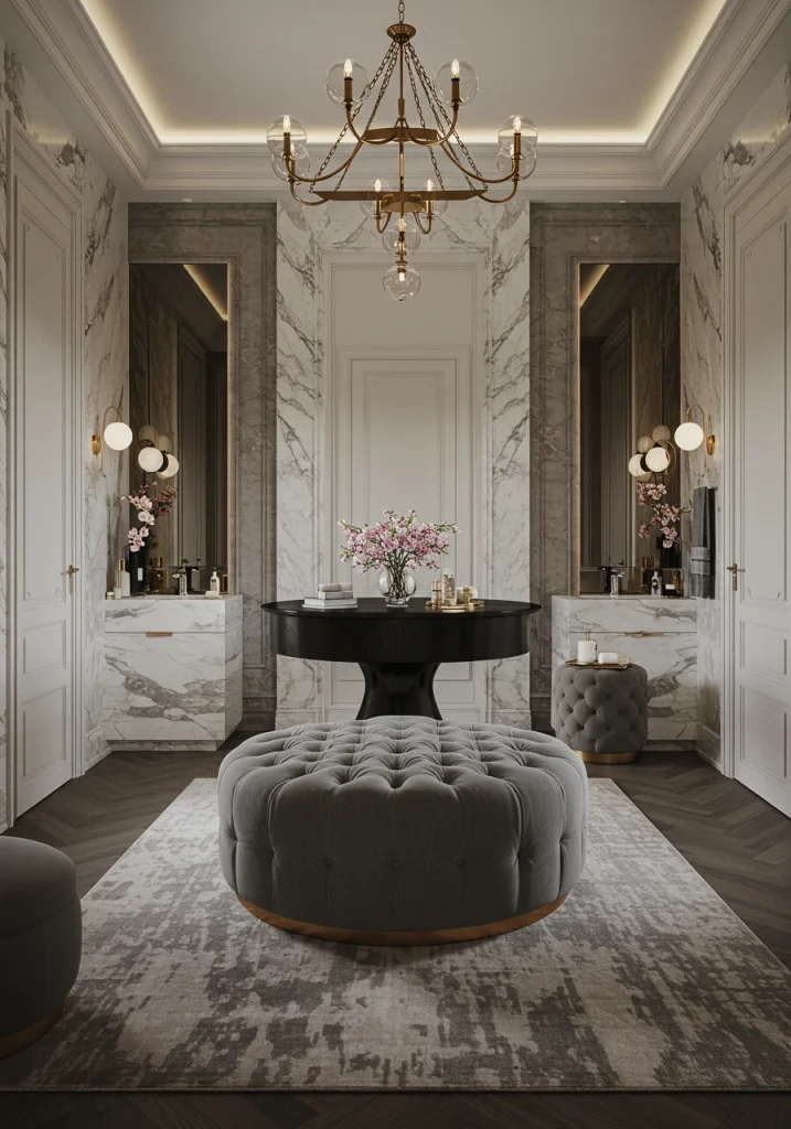 - An Upholstered Bench: A beautiful, upholstered bench at the foot of a vanity or along a wall is a classic choice.