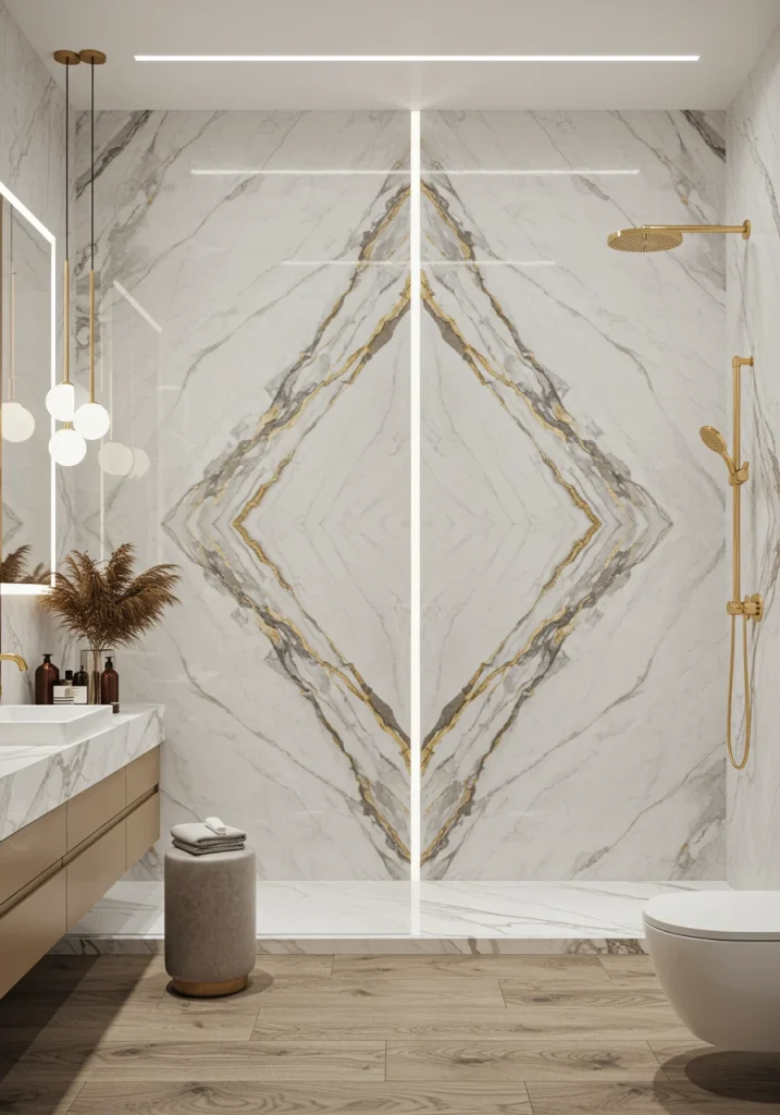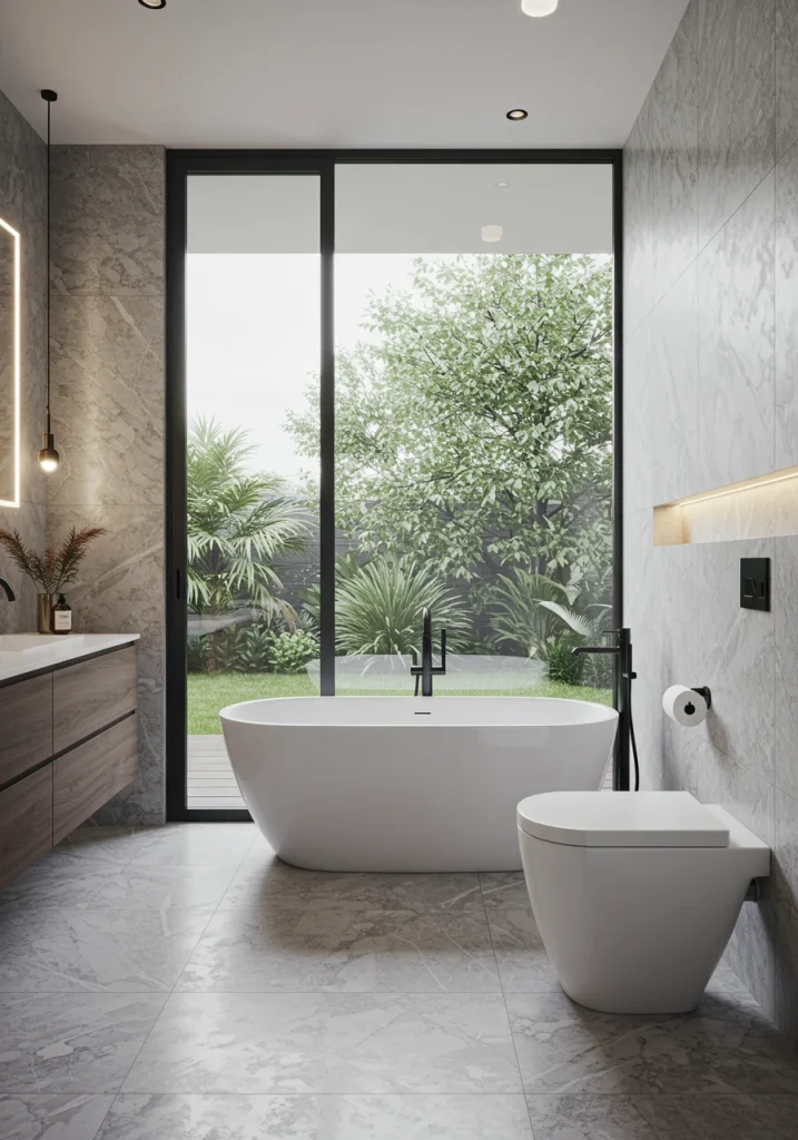To create a very high-end, seamless, and dramatic look in your master bathroom, use large-format stone or porcelain slabs for your walls and floors. Instead of using small tiles with their busy grout lines, a single, large, floor-to-ceiling slab of a beautiful, veined stone creates an uninterrupted, monolithic work of art. This is a technique that is often used in the world’s most luxurious hotels and residences and is a true statement of opulence.
