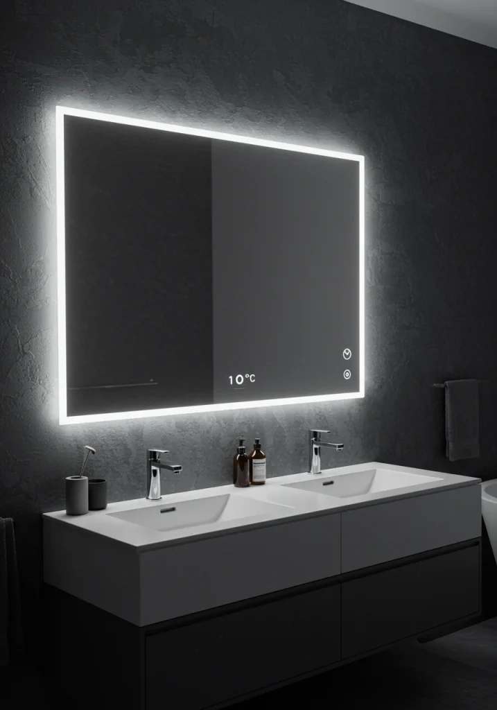 For a cohesive and high-tech enhancement, choose a backlit mirror to hang above your floating vanity. The combination of the light glowing from behind the mirror and from under the vanity creates a stunning, layered, and very modern lighting effect.