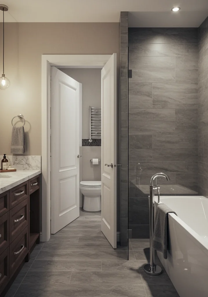 A “water closet,” or a separate, enclosed room for the toilet, is a feature that is a true hallmark of a high-end, luxurious master bathroom. It provides a level of privacy that is both practical and sophisticated. By separating the toilet from the main vanity and bathing areas, it allows two people to comfortably use the bathroom at the same time.