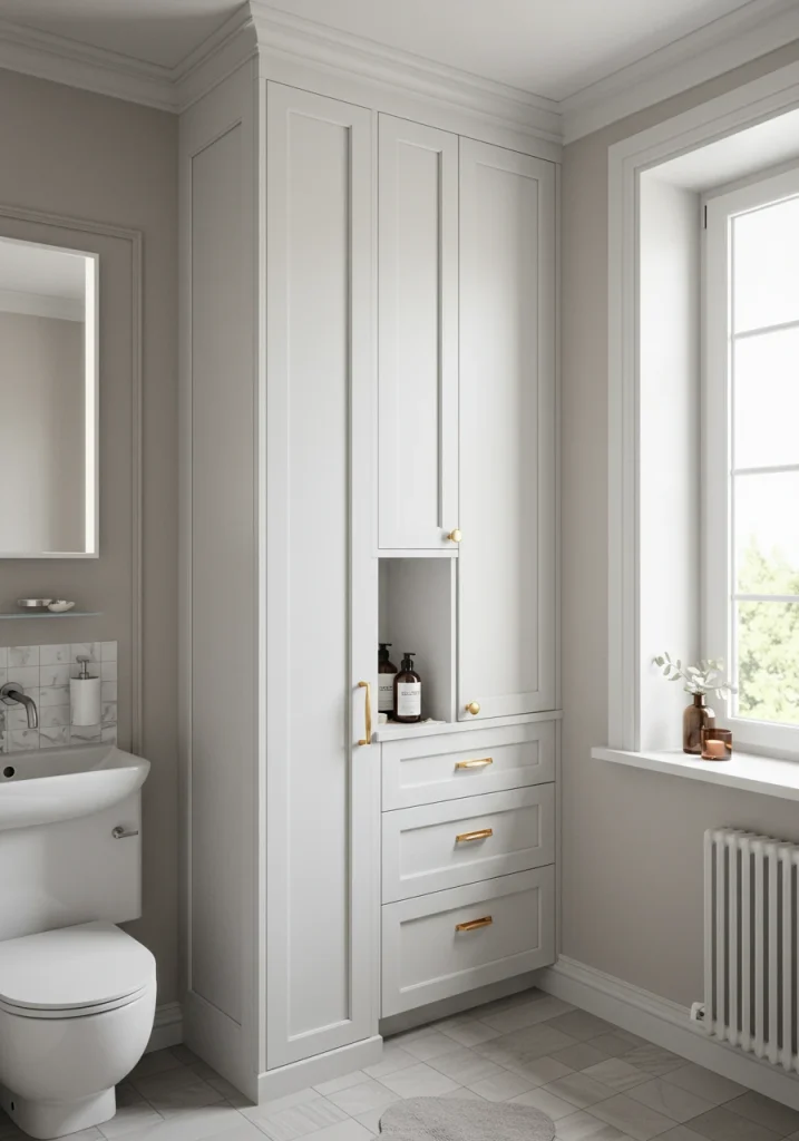 For a look that is truly custom, organized, and luxurious, there is no substitute for floor-to-ceiling, built-in cabinetry. As your reference image of the tall, white cabinet shows, this type of storage can be both incredibly functional and a beautiful, architectural feature. A tall, built-in linen tower can provide a huge amount of hidden storage for towels, toiletries, and cleaning supplies, keeping your bathroom feeling serene and completely clutter-free.