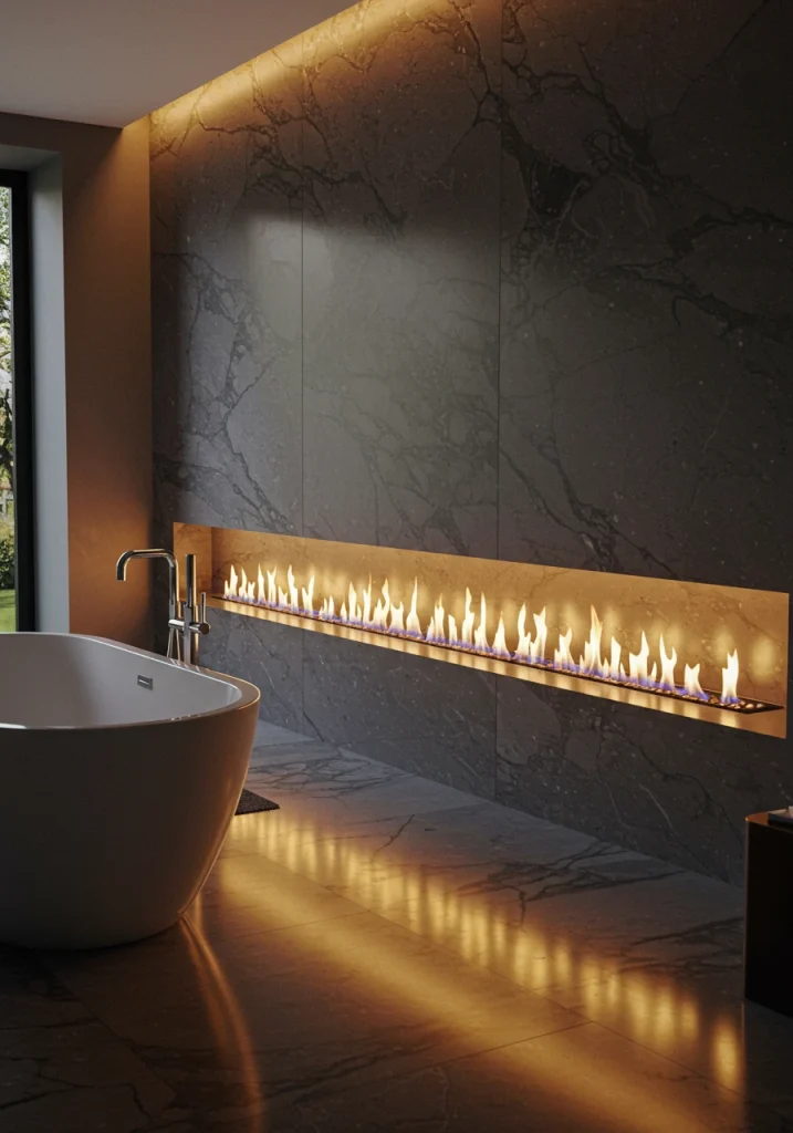 Modern, ventless gas or electric fireplaces are very safe and easy to install in a bathroom, and they come in a variety of sleek, linear styles that are perfect for a contemporary design. I love to design a low, horizontal fireplace into a wall near the freestanding tub.