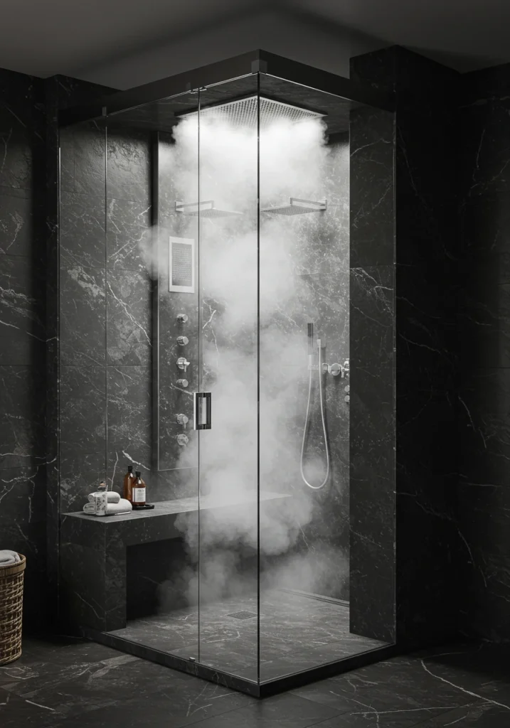 A large, beautifully designed, walk-in shower is a cornerstone of a modern luxury bathroom. To elevate it to a true spa-like experience, incorporate a steam shower function. A steam shower is a fully enclosed shower that uses a steam generator to create a warm, humid, and deeply relaxing steam room. It’s a therapeutic feature that is wonderful for your skin, your sinuses, and for melting away stress.
