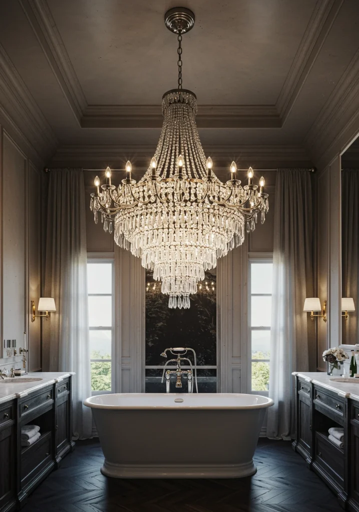 The lighting in your master bathroom should be both functional and beautiful. A stunning, statement light fixture can serve as the “jewelry” of the room, adding a powerful dose of glamour, drama, and sophisticated style. A beautiful chandelier or a pair of sculptural pendant lights can completely transform the look and feel of your bathroom, elevating it from a simple utility space to a truly luxurious retreat.
