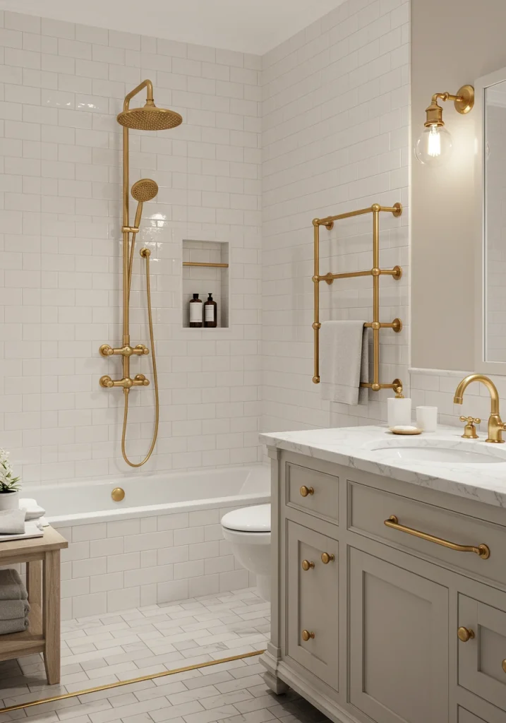 The fixtures in your bathroom—your faucets, your showerhead, your cabinet hardware—are the “jewelry” of the room. Choosing high-quality fixtures in a beautiful, warm, metallic finish is a key way to add a layer of luxury and sophistication. While chrome is a classic, the trend in high-end design is to use warmer, more complex finishes like brushed brass, aged gold, or even a deep, oil-rubbed bronze.