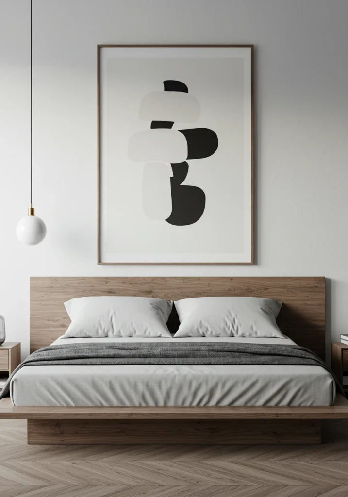 The minimalist approach to art. Instead of a gallery wall a single oversized art piece is the modern focal point. A makeover that includes a large abstract painting (with a simple black and beige design) or a large-scale black and white photograph hung above the bed is a confident stylish statement.