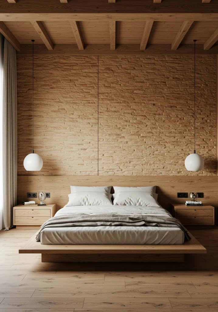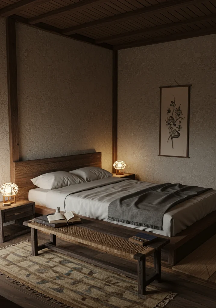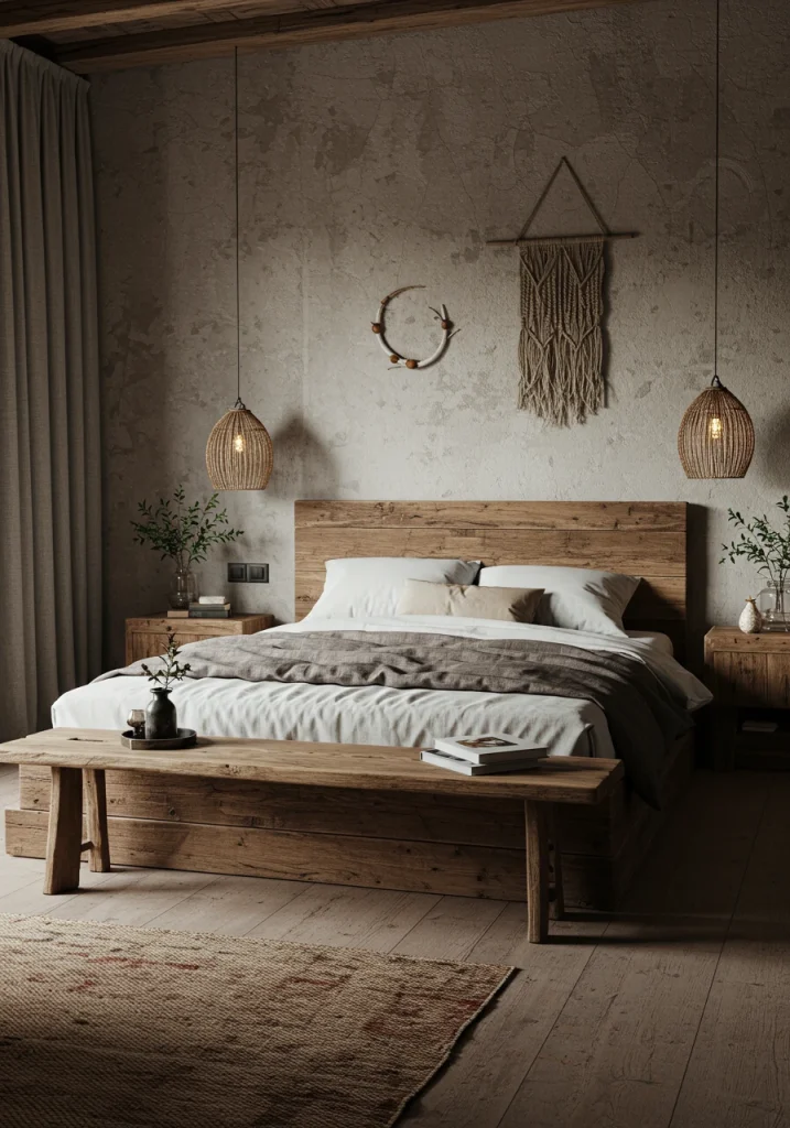 A minimalist bedroom only has intentional furniture. A simple wooden bench (either Shaker-style or a rustic reclaimed wood slab) at the foot of the bed is a perfect multi-functional piece. It adds a natural (2026 trend) organic element a place to sit and a spot to lay out clothes.