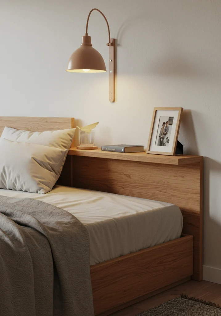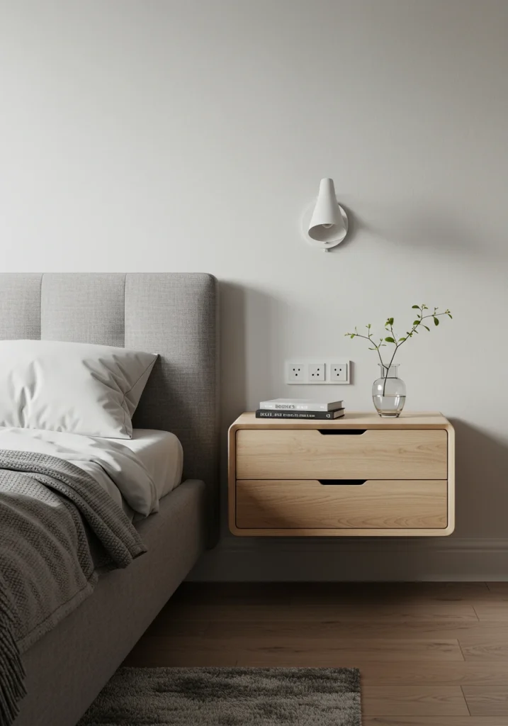 A modern and space-saving essential. A floating or wall-mounted nightstand (often just a simple drawer or a box) is a smart design that keeps the floor clear. This makes the room feel more airy uncluttered and spacious.
