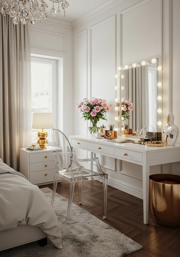 A classic minimalist trick. A ghost chair or a clear acrylic console table takes up zero visual weight. Because you can see right through it your eye is not stopped by a bulky piece of furniture making it perfect for a stylish small bedroom.