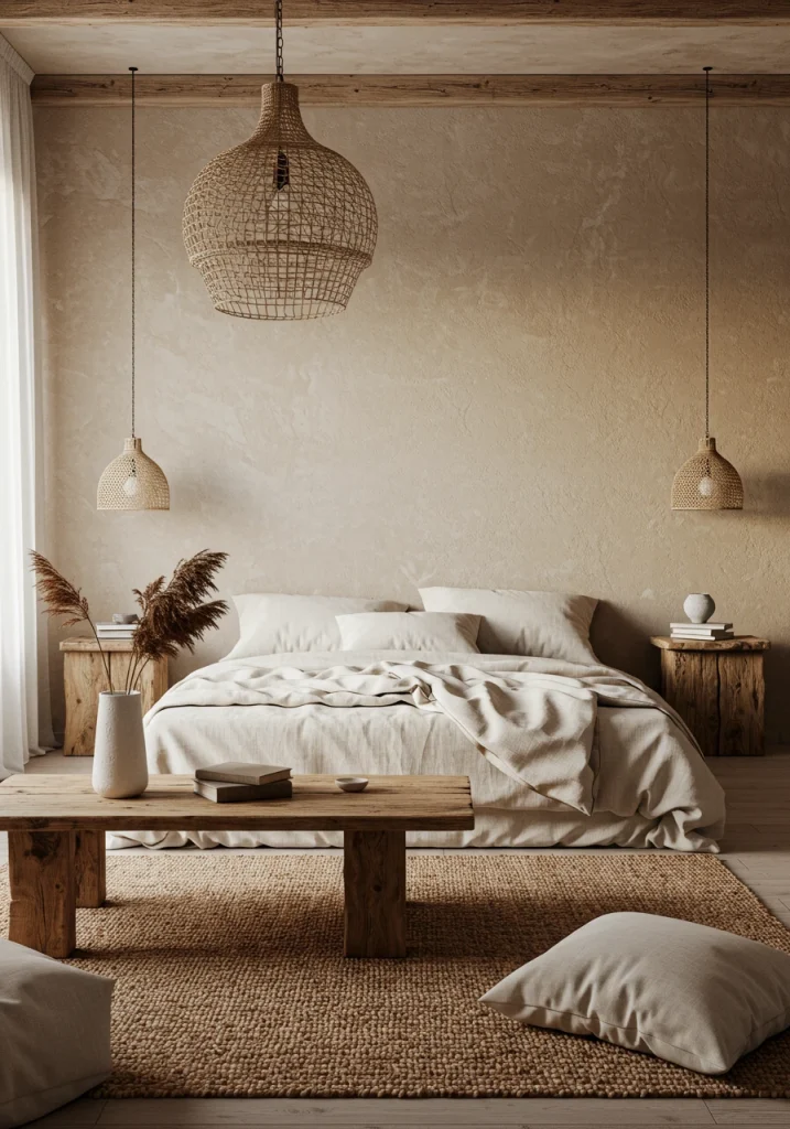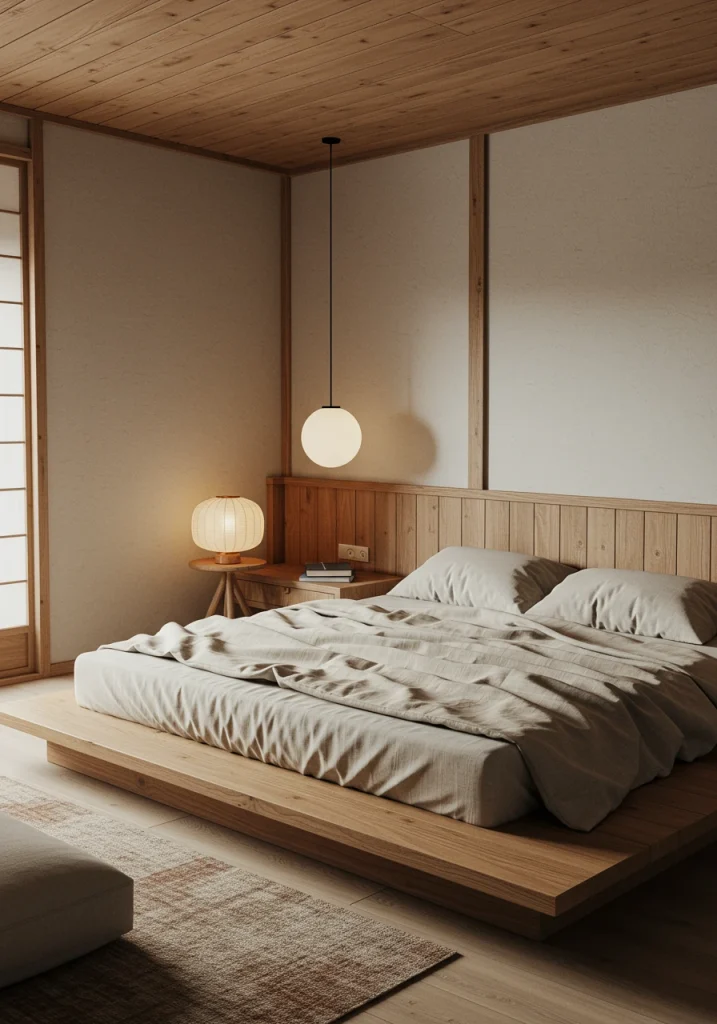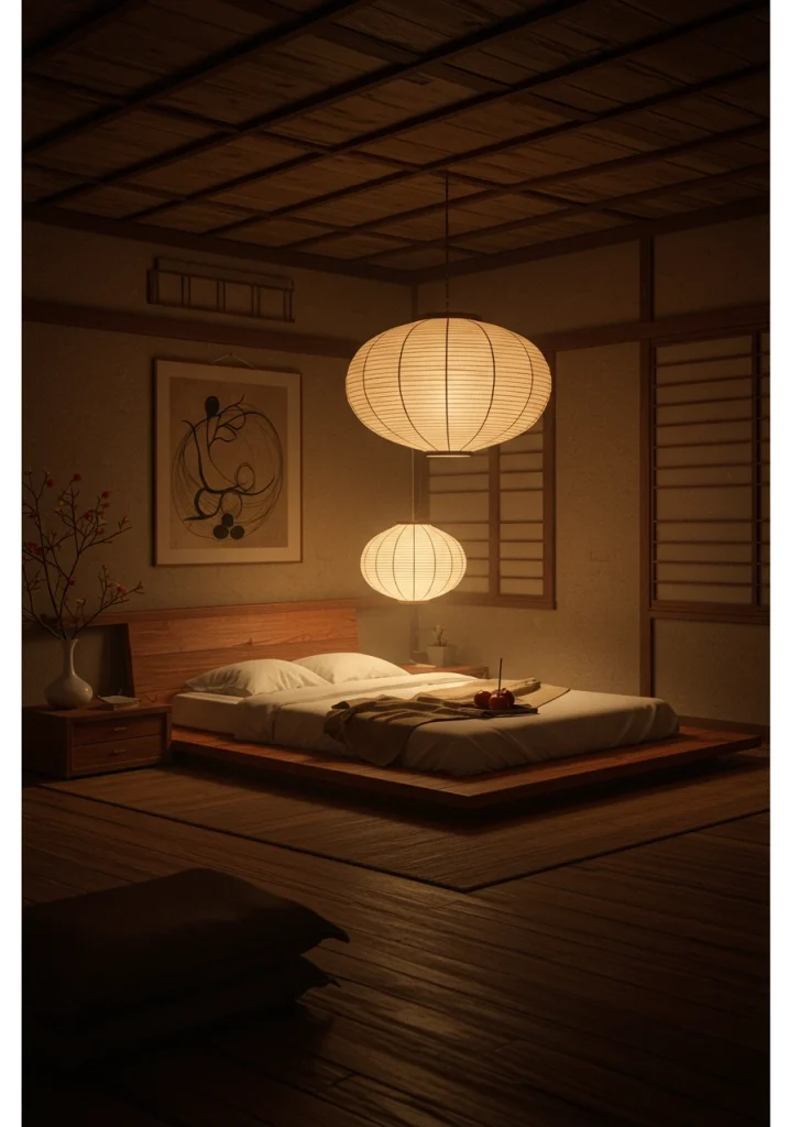 A key Japandi and minimalist idea. Remodel your lighting. Remove any harsh overhead lights and install a single large sculptural pendant light (like a paper lantern or a woven rattan fixture) often hung low and off-center over a nightstand or in a corner.