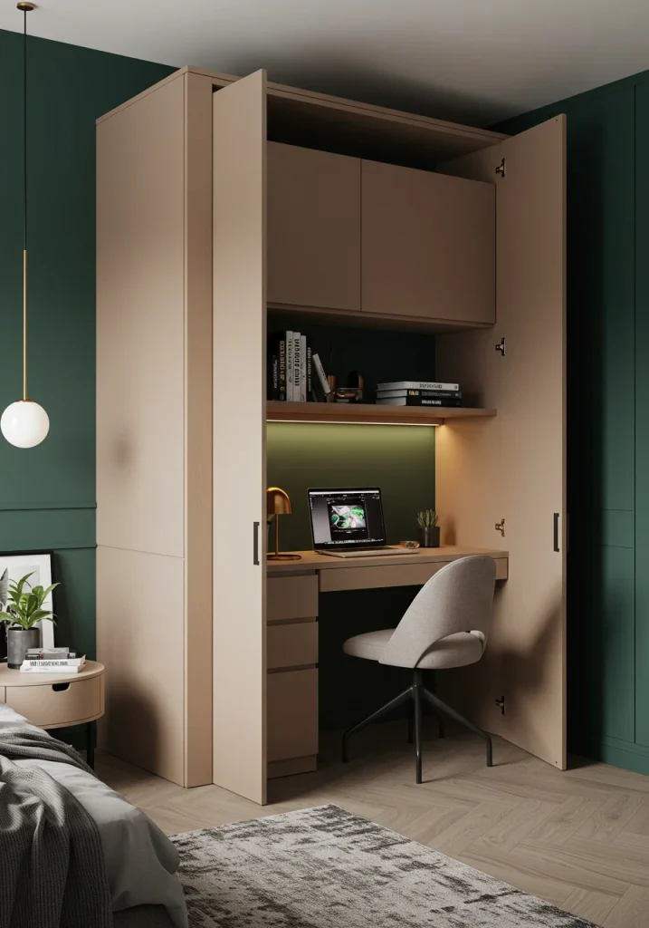 A key 2026 multi-functional trend for a modern home. This makeover transforms your bedroom closet into a compact cloffice (closet-office). Remove the doors add a built-in desktop install floating shelves and add a small stool or chair.