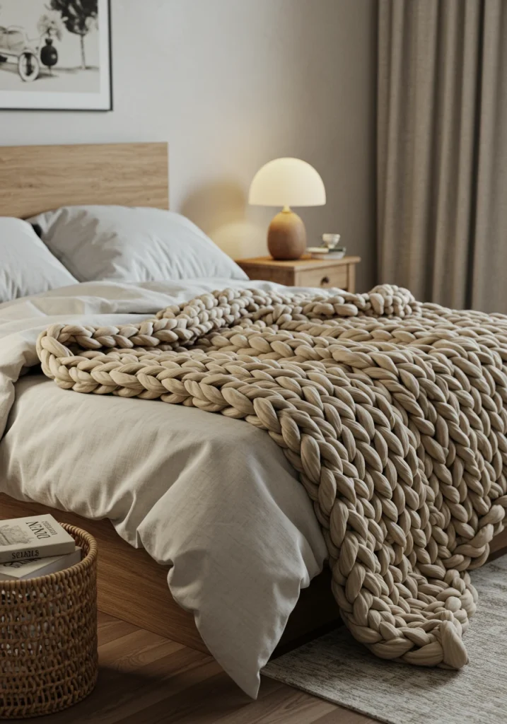An essential cozy element. A makeover for your bed (as seen in your reference image). A large oversized chunky knit blanket in a soft neutral color like cream or gray draped over your bed instantly adds a sculptural textural layer of warmth.