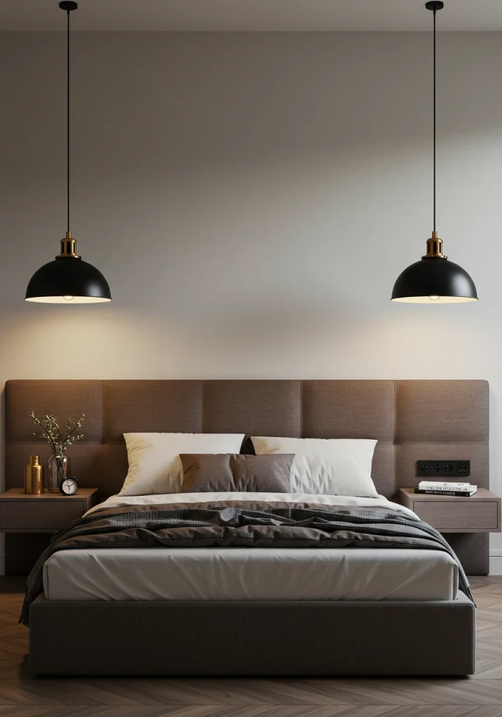 A smart design to free up nightstand space. This makeover involves hanging a pair of small minimalist pendant lights (like a simple exposed bulb or a small metal cone) low from the ceiling on either side of the bed.