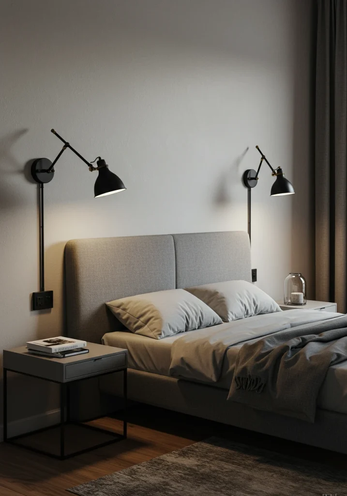 The ultimate hotel-chic and functional remodel for a minimalist bed. Install a pair of wall-mounted reading sconces on either side of the headboard. This frees up all your nightstand space. Articulating swing-arm sconces are the most modern and functional choice.
