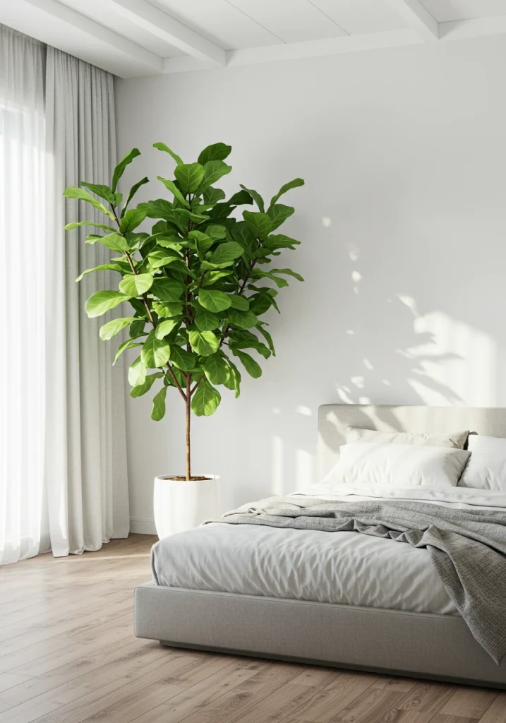A core 2026 organic modern trend. A minimalist room can feel sterile. The makeover is to add one large sculptural houseplant. A single large Fiddle Leaf Fig tree or a Monstera in a simple ceramic planter in the corner adds life color and an organic shape.
