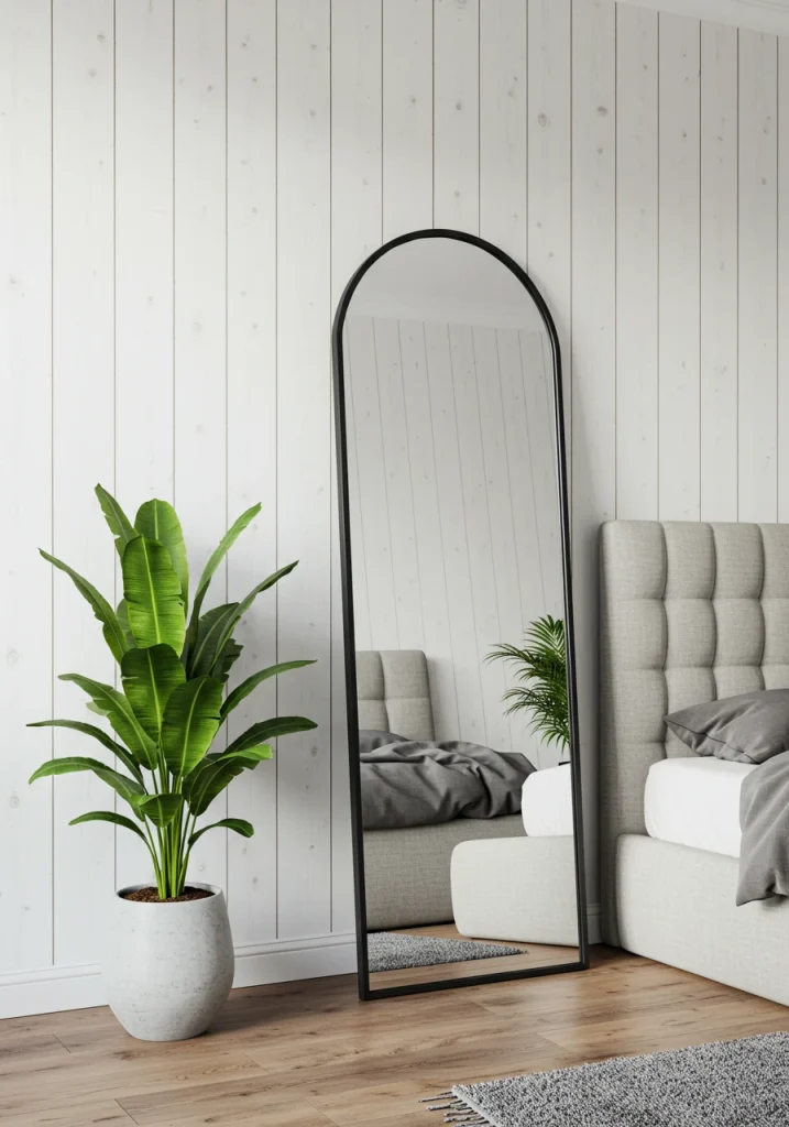 A key 2026 fluid geometry trend. This makeover adds light and style. A very large oversized full-length floor mirror with a soft arched top and a thin metal frame (often black or brass) is leaned casually against the wall to make the room feel bigger.
