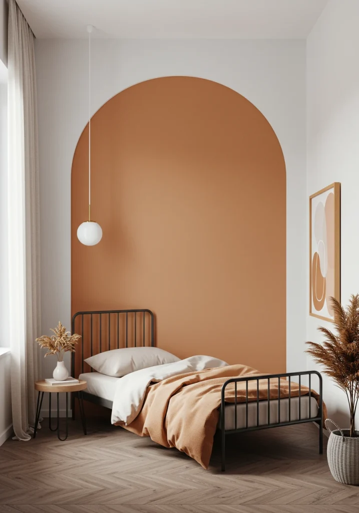 A key 2026 earthy color. Instead of a full makeover paint a single graphic shape in a warm terracotta or clay color (like Reddened Earth) on the wall behind the bed to act as a virtual headboard. It adds a pop of warm color without the clutter of a real headboard.