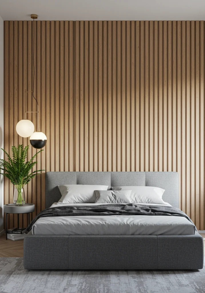 A key feature of the Organic Modern 2026 aesthetic. Remodel one wall with vertical wood slats (especially in a light oak or a rich walnut). This adds a clean architectural and rhythmic textural element that is both sophisticated and visually warming.