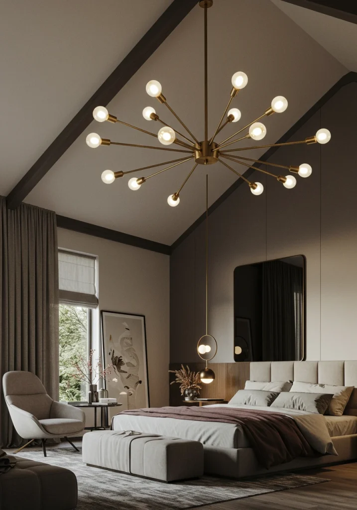 The lighting in a luxurious bedroom should be a piece of art. A stunning, sculptural, and modern chandelier can serve as the primary focal point of the room, adding a layer of drama, sophistication, and beautiful, ambient light. In modern luxury, this isn’t the classic, crystal-draped chandelier of the past, but rather a bold, artistic, and often minimalist light sculpture.