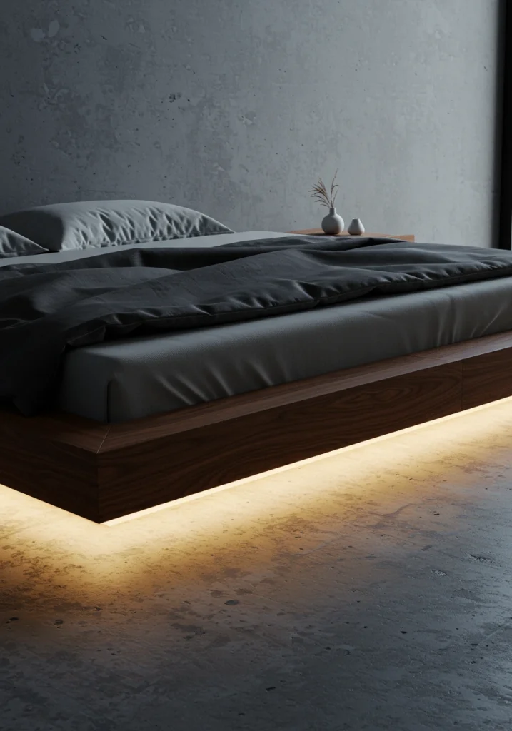 For the ultimate enhancement, install a soft, warm, motion-activated LED light strip under the edge of the floating platform. When you get out of bed at night, a soft, gentle glow will automatically illuminate the floor around the bed, acting as a perfect, safe, and very chic nightlight.