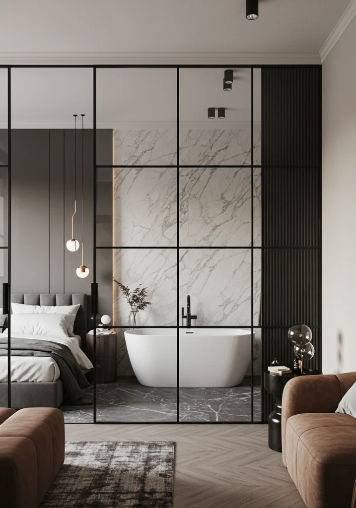 In a modern master suite, a very chic and luxurious design move is to use a glass wall or a partition to separate the bedroom from the ensuite bathroom. This creates a seamless, open-plan feel, allowing light to be shared between the two spaces and making the entire suite feel much larger and more open. It’s a bold, high-end look that is often seen in boutique hotels and contemporary architectural homes.