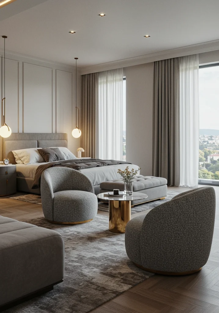 A truly luxurious master bedroom is a “suite”—a multi-functional space that serves as a private retreat for more than just sleeping. Carving out a dedicated seating area is a key way to elevate your bedroom to this level. It provides a comfortable, intimate spot for reading, enjoying a morning coffee, or having a quiet conversation, all within the privacy of your personal sanctuary.
