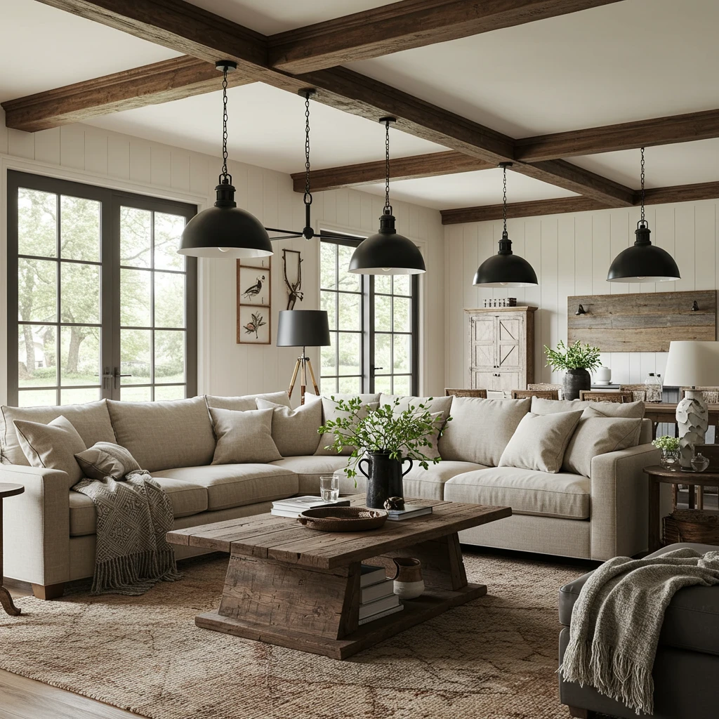 A modern farmhouse living room remodel for 2025 seamlessly blends rustic charm with sleek, contemporary updates. This design aesthetic champions clean lines in furniture and architecture, beautifully juxtaposed with natural wood accents and a palette of warm, inviting neutral colors.