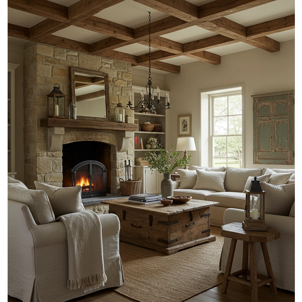A farmhouse living room remodel for 2025 beautifully embraces rustic charm while incorporating modern comforts. Integrate classic elements like exposed wooden beams (or faux beams for a similar look) and distressed furniture with a warm, inviting patina. Pair these with neutral palettes for walls and larger furnishings, then introduce soft textiles like linen or cotton in throws and upholstery.