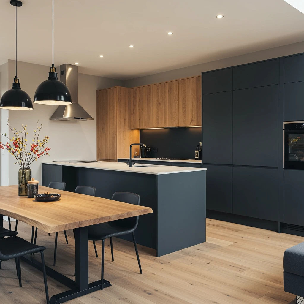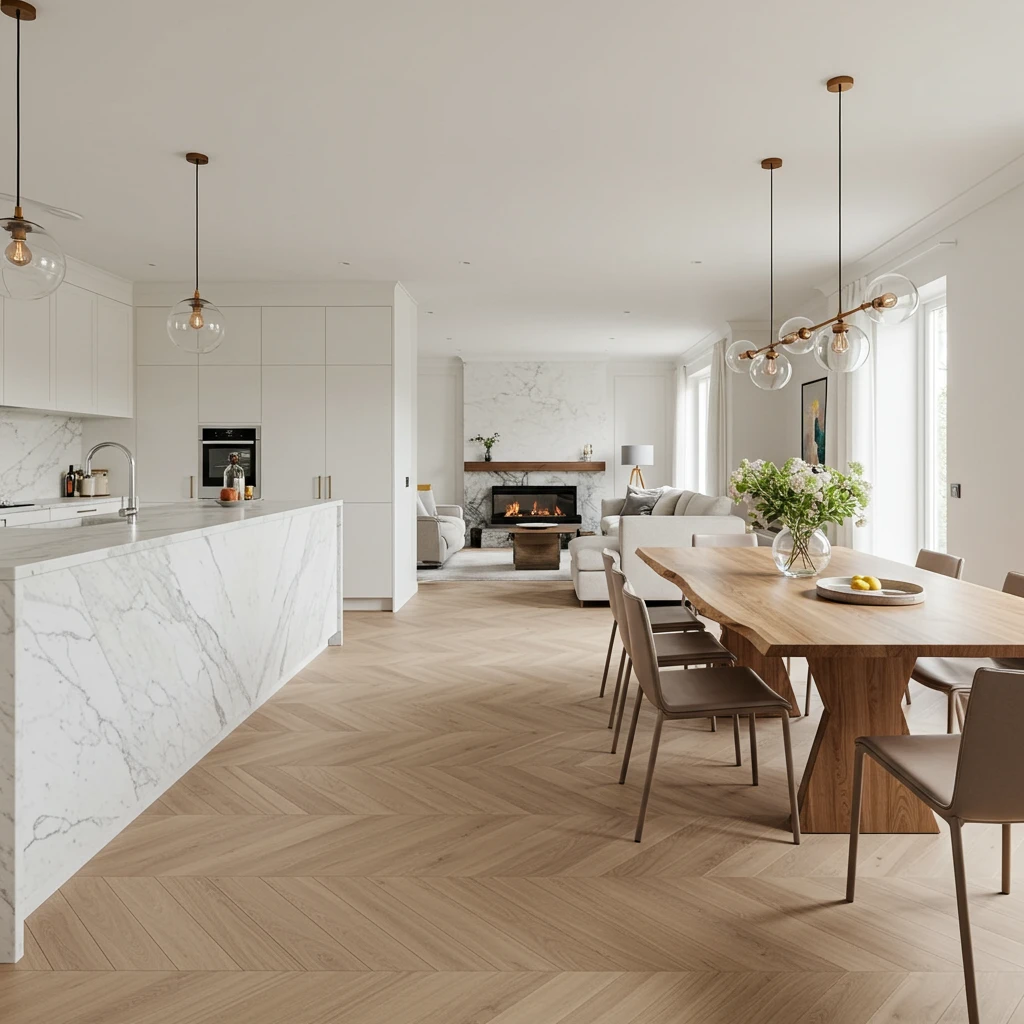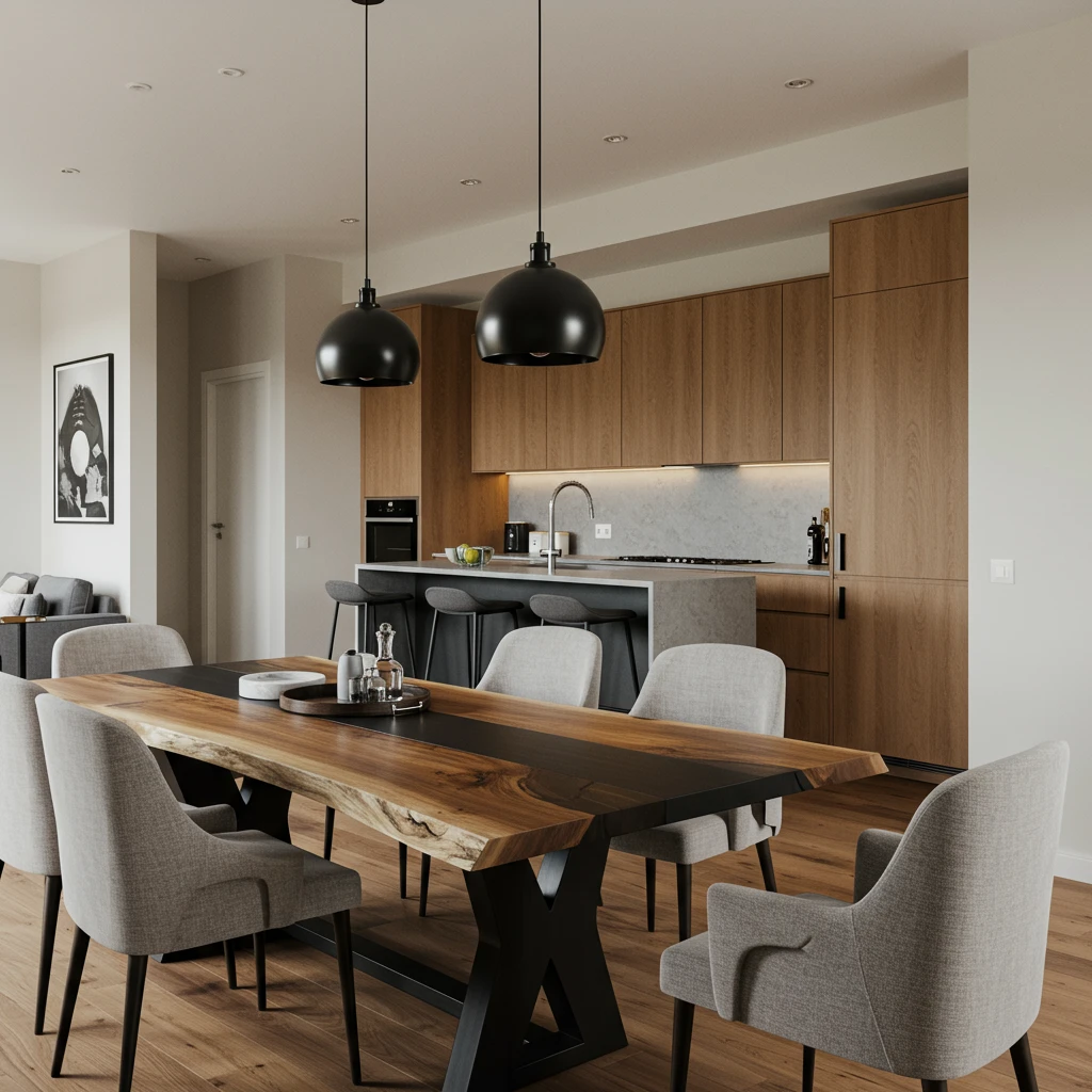 Create a captivating focal point in your open space with a warm wood and live-edge dining table. This organic centerpiece brings natural beauty and a unique, handcrafted feel. Paired with modern chairs and an open kitchen, it offers a sophisticated blend of rustic charm and contemporary design that defines 2025 open-concept trends.