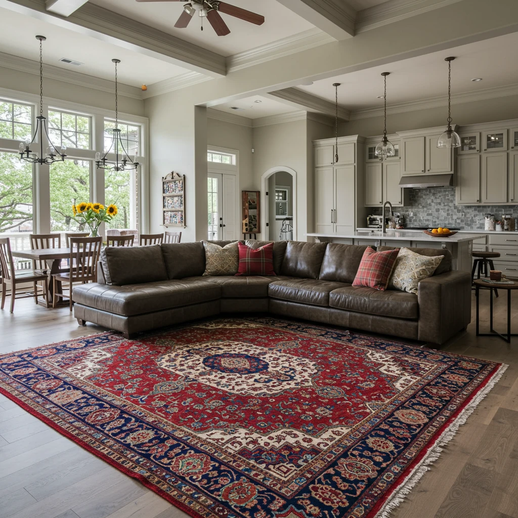Use statement area rugs as powerful tools to anchor and define specific zones within your open kitchen living room. A large, vibrantly patterned or richly textured rug can visually separate the living area from the dining or kitchen space, adding warmth, color, and a sense of completeness to each designated zone.