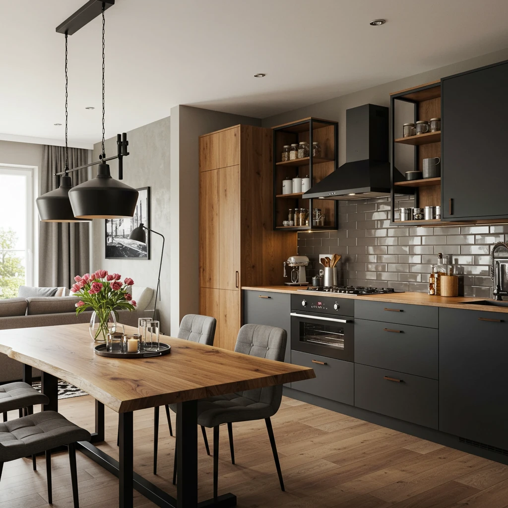 Infuse your open-concept space with character by incorporating warm industrial accents. This trend pairs the raw edge of industrial design (like black metal or concrete finishes) with warm materials (like natural wood or soft textiles) to create a space that is both chic and inviting. Think black steel table bases, exposed lighting, and rich wood tones.