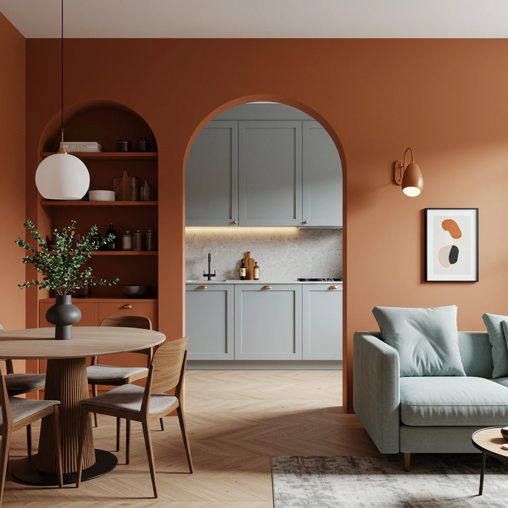 Bring a sense of grounding warmth to your open space with earthy and terracotta accents. This 2025 trend uses natural, muted tones like terracotta, warm browns, and muted greens in decorative elements, pottery, and accent walls to create a cozy and inviting atmosphere that connects to nature.