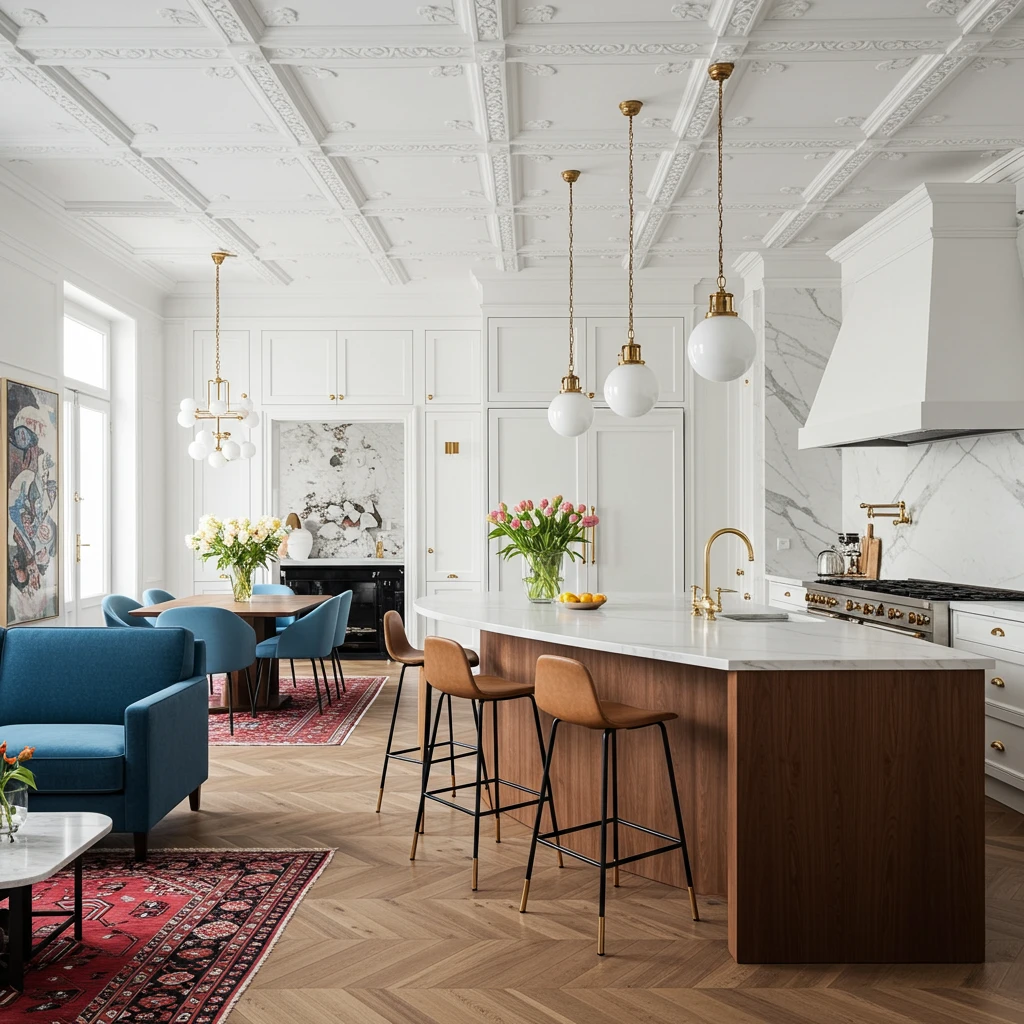 Architectural ceiling features like elegant coffered designs or exposed wooden beams can draw the eye upward, creating a sense of grandeur and visually delineating the kitchen or dining area from the living space without needing walls.