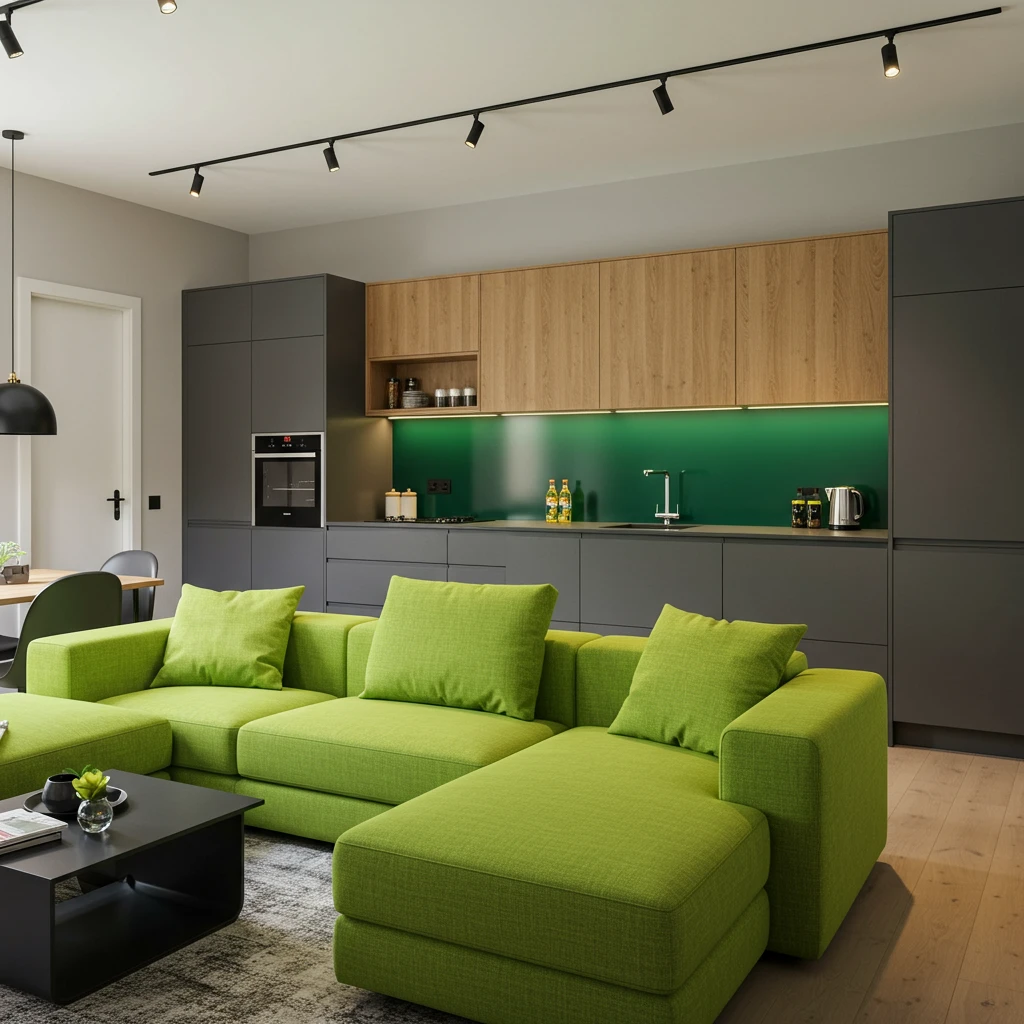 Inject vibrant energy into your open space with a bold color pop set against a modern, sleek backdrop. For 2025, this trend uses a striking hue on an accent wall or in key furniture pieces to create a dynamic visual anchor. Pair this with dark, minimalist cabinetry and warm wooden accents for a sophisticated, contemporary look that feels energetic and inviting.