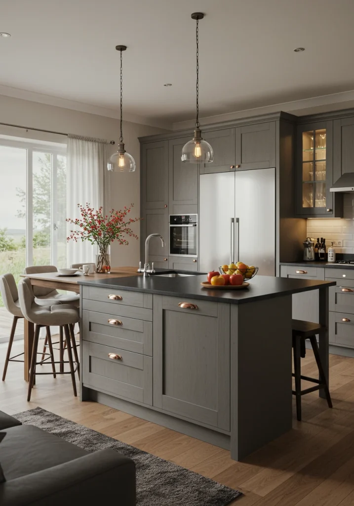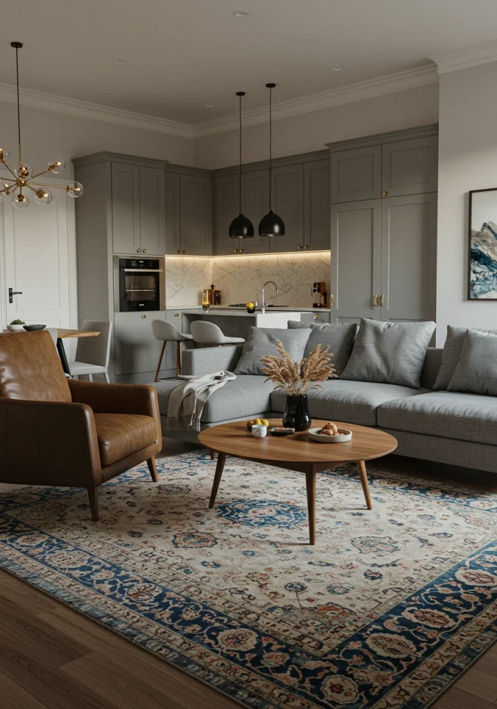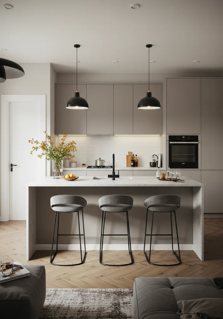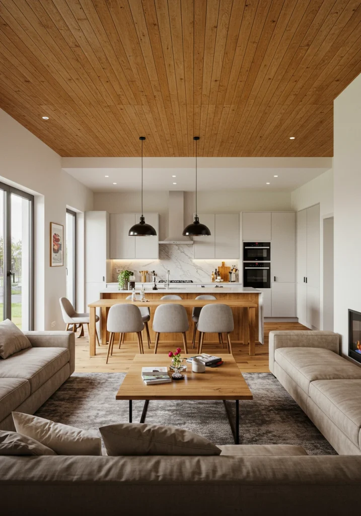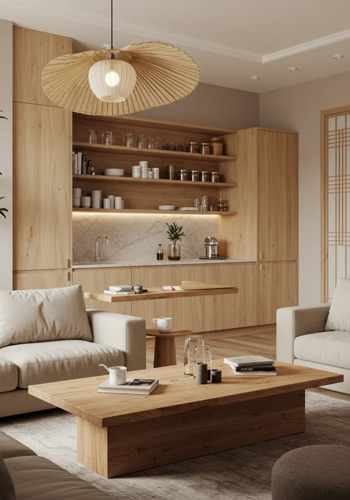 This is a top 2026 design trend that is perfect for open kitchen living rooms. It blends Scandinavian function with Japanese minimalism. It focuses on warm neutral palettes natural materials (like light wood and rattan) clean lines and a clutter-free calm atmosphere.