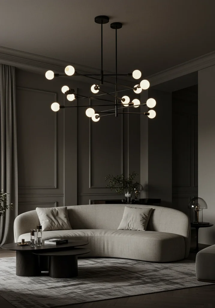 In an open-plan room a large statement light fixture is a 2026 essential. A massive sculptural chandelier or pendant light hung over the living room seating area acts as a visual anchor. It clearly defines the living zone and gives it a sense of place and importance just like an island does for the kitchen.
