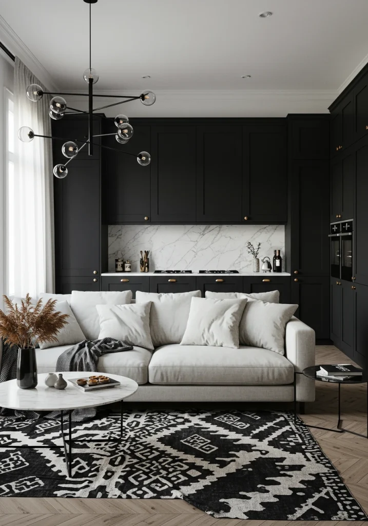 A timeless and graphic layout. Use a bold black and white palette to create a cohesive high-contrast look. This could be black kitchen cabinets and a black accent wall in the living room all balanced with white walls and a white sofa. This is a very modern and confident design.
