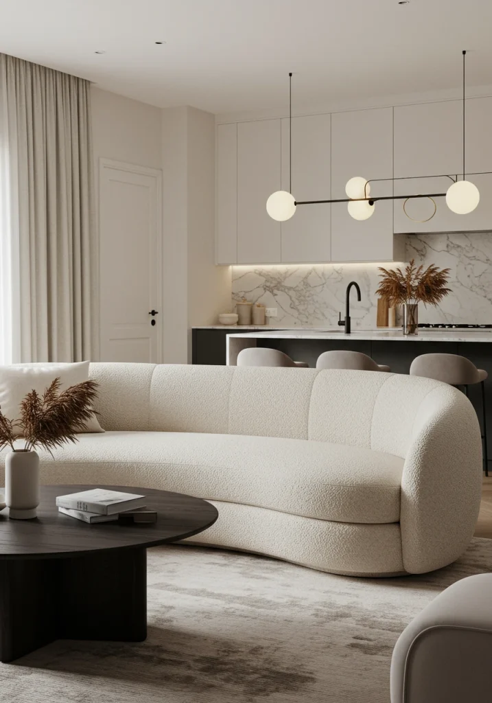 17. The “Fluid Geometry” Curved Sofa (2026 Trend)