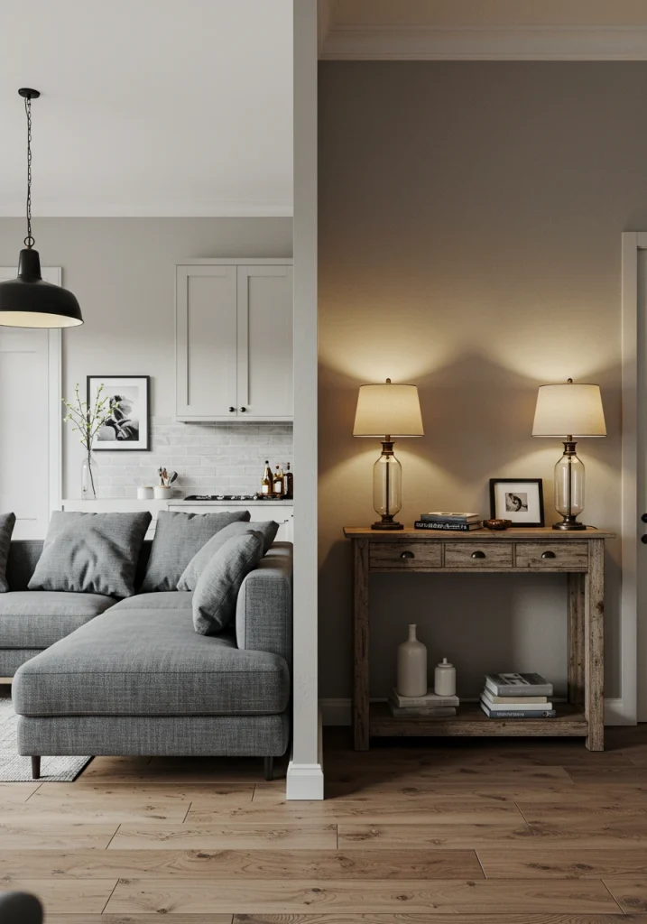 This is the number one layout trick for defining a living room. Float your sofa (pull it away from the walls) in the middle of the room with its back to the kitchen. Then place a slim console table directly against the back of the sofa. This creates a stylish and functional half-wall that defines the start of the living area.