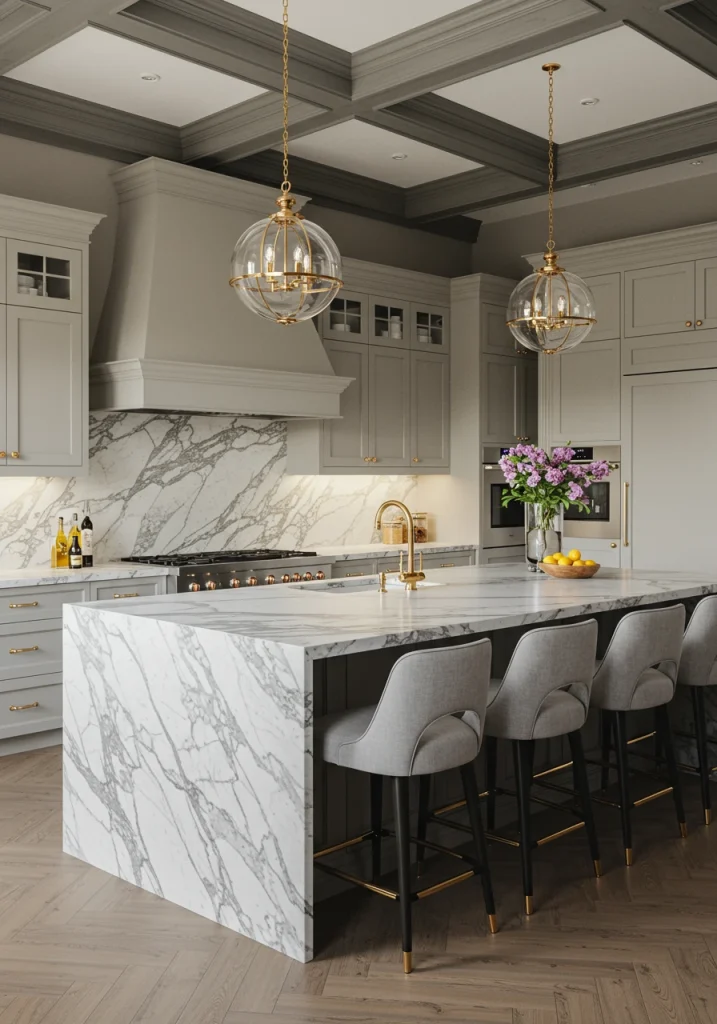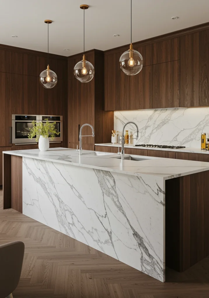 A sleek modern design where the countertop material (usually a veined stone or quartz) flows vertically down the sides of the island to the floor creating a continuous seamless and architectural look. It turns the island into a sculptural centerpiece.