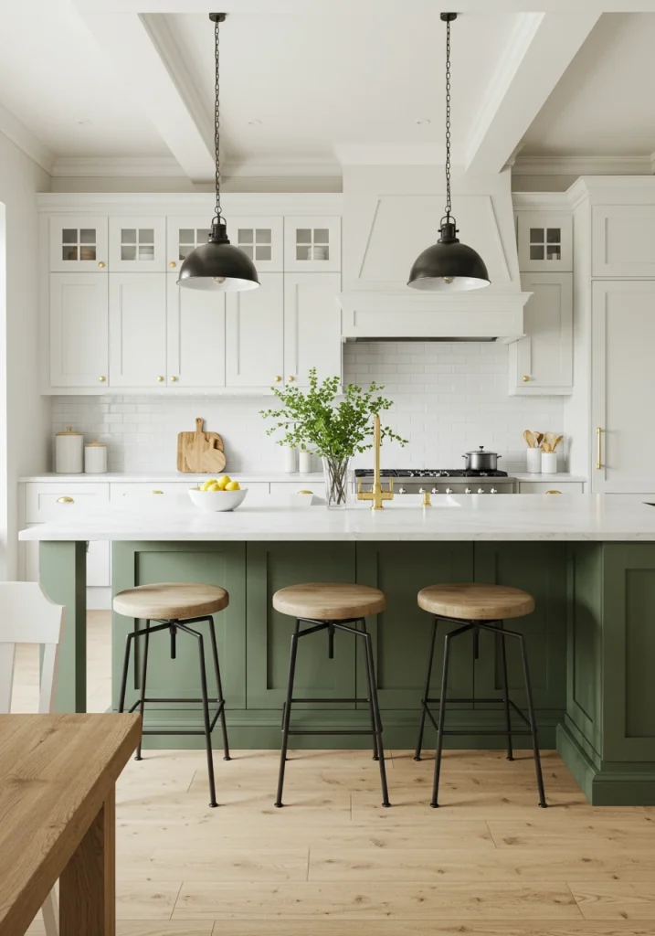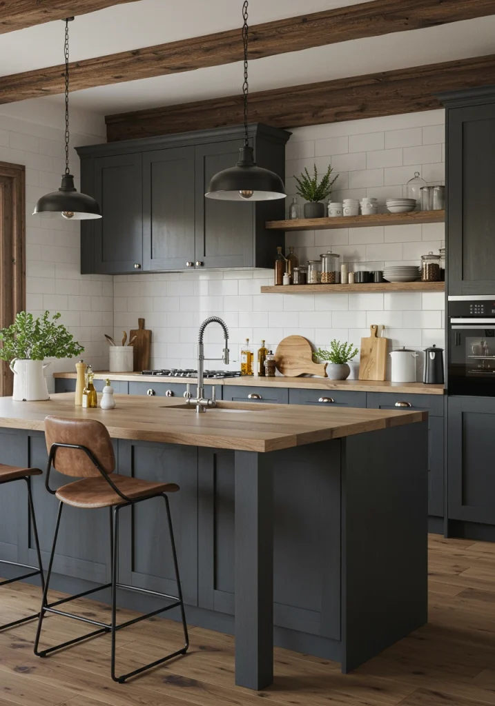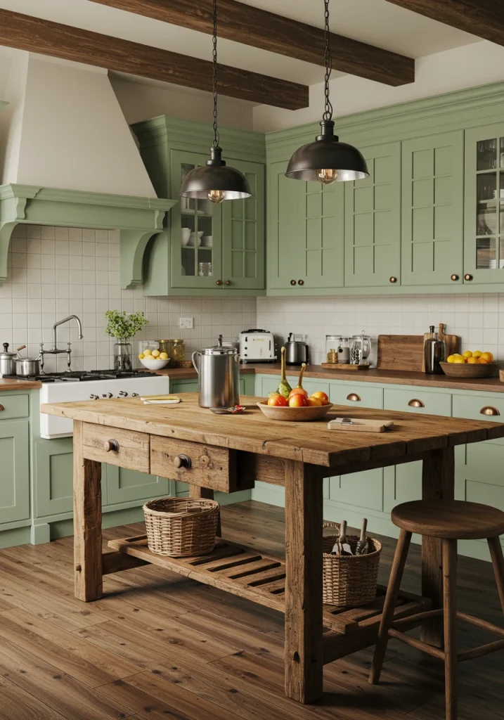 A key 2026 modern cottage trend. Instead of a bulky built-in island use a freestanding furniture-style piece like a rustic antique butcher block table or a modern stainless steel chef’s table. This creates a lighter more airy and collected look in your open kitchen.