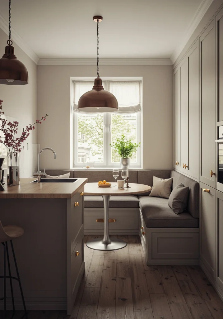 A brilliantly smart and stylish design where a built-in banquette seating for a dining nook is attached directly to the back of the kitchen island. This transforms a simple island into a multi-functional dining and prep hub in one cohesive unit.
