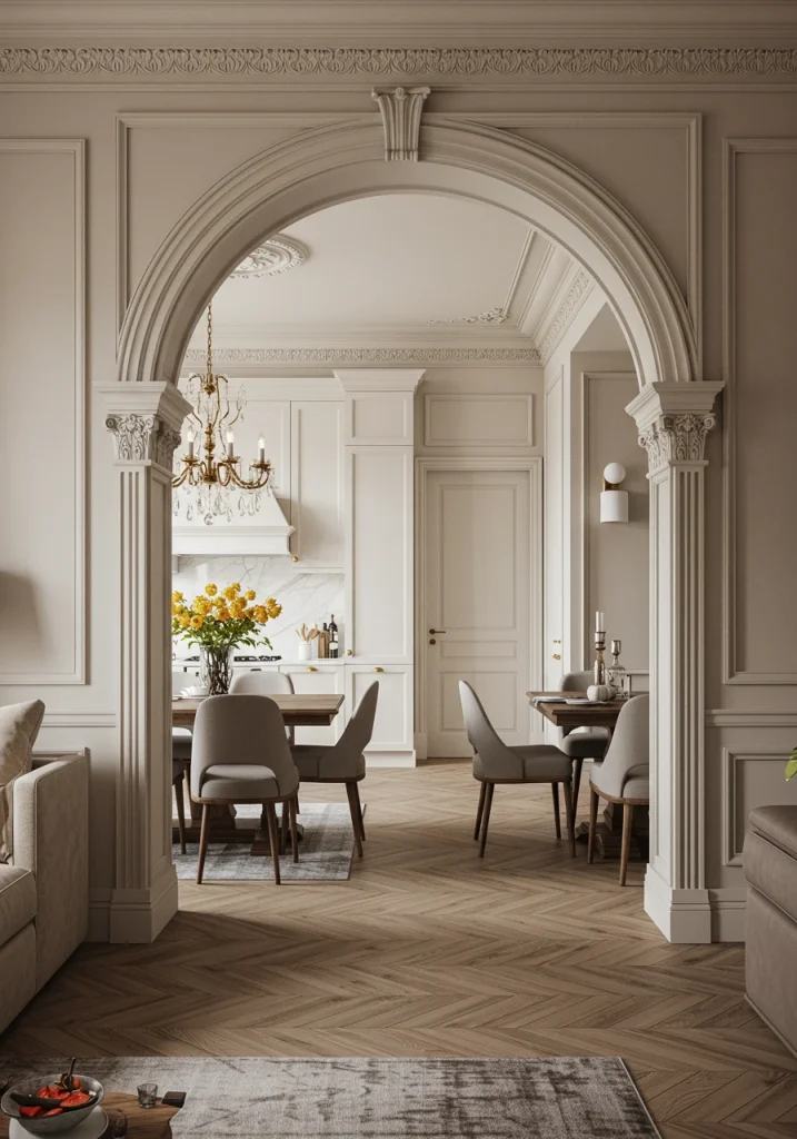 Use fluid geometry (a top 2026 trend) to create a graceful architectural threshold between the kitchen and living room. This makeover replaces a standard square opening with a wide soft archway which defines the spaces as separate-but-connected and adds a timeless elegant feel.