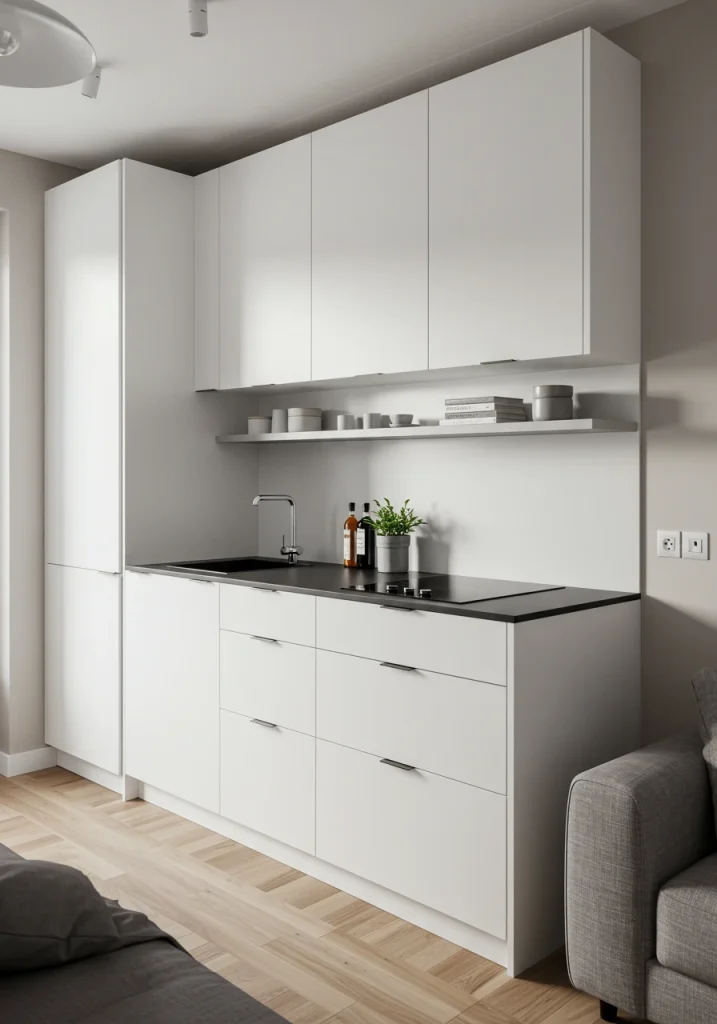 The ultimate space-saver for small apartments or studio lofts. In this layout the entire kitchen (cabinets appliances and sink) is installed along a single wall. This leaves the rest of the open-plan room completely flexible for a living and dining area often defined by a floating sofa.