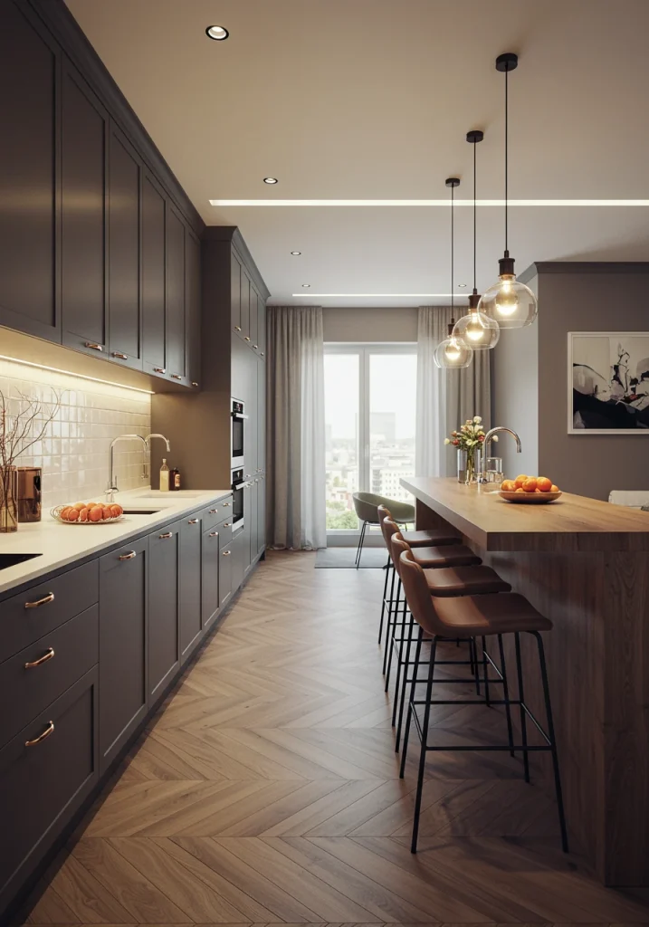This modern layout keeps the kitchen’s messy work zone contained while still feeling open. It consists of two parallel counters but one of them is a large open pass-through or a peninsula that looks directly into the living room creating a social bar area.