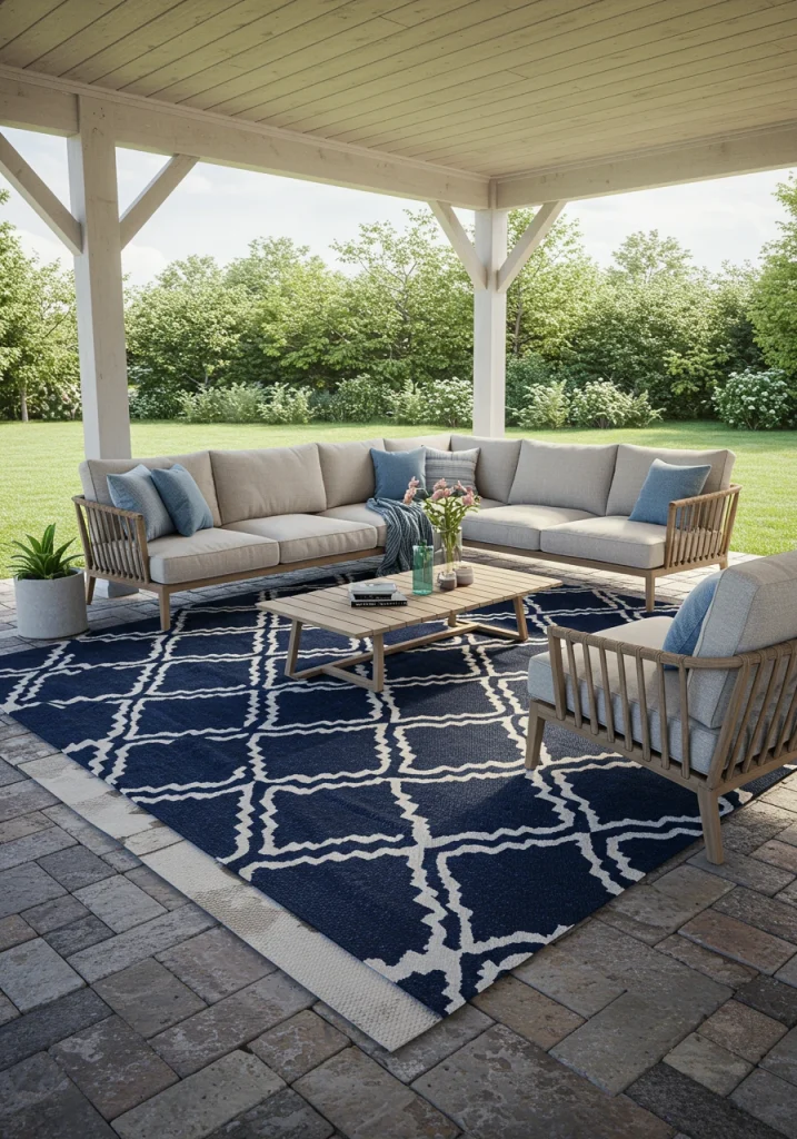 For an enhancement, layer a smaller, more textural rug, like a round jute rug (which can be brought out for gatherings), on top of your larger, all-weather outdoor rug. This adds a sophisticated, layered look often seen in high-end interior design.