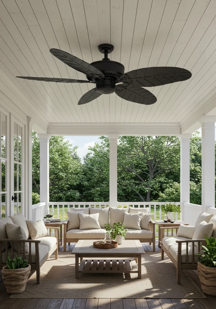 This is a functional upgrade that has a huge impact on how much you will actually use your outdoor living room when the weather is warm. As a designer, I know that comfort is the key to a successful space. It’s essential to choose a fan that is specifically rated for outdoor use, which means it is designed to withstand moisture and humidity.