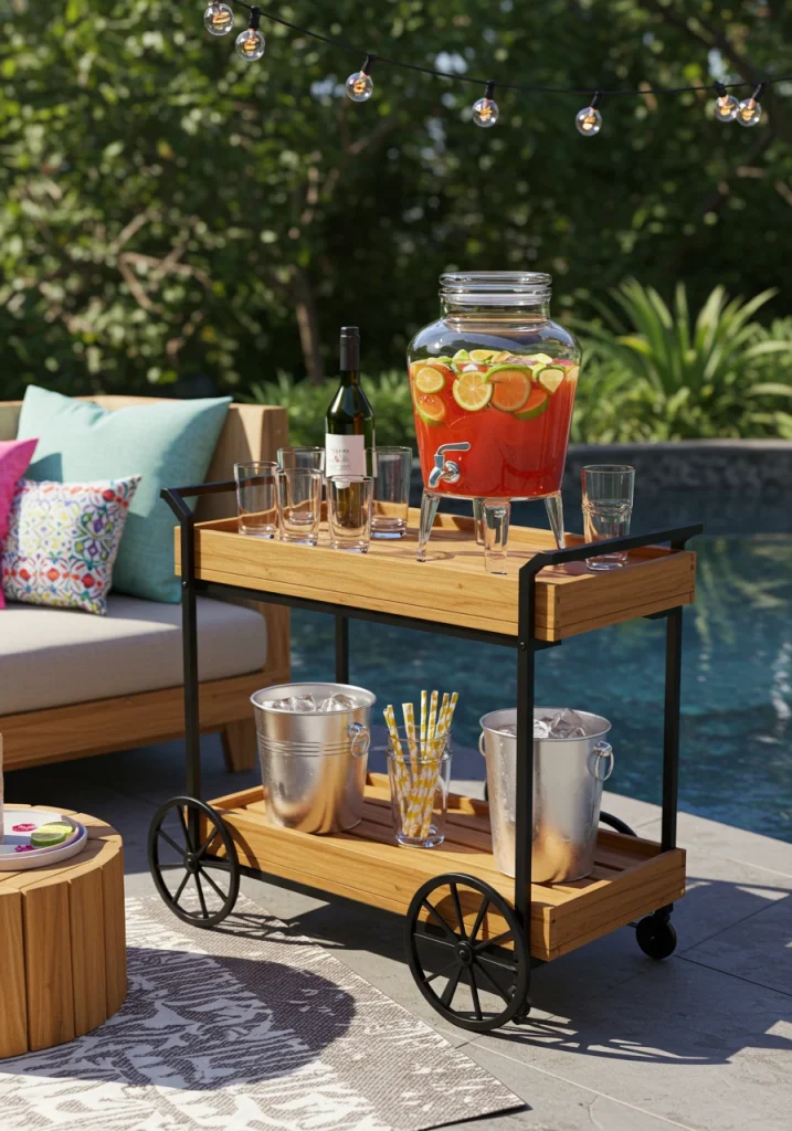 For those who love to entertain, a mobile bar cart is a fantastic and stylish addition to an outdoor living room. It’s a flexible and space-saving alternative to a large, built-in bar. You can stock it with your favorite drinks, glassware, and an ice bucket, and then easily roll it out to your seating area when guests arrive. It makes serving drinks incredibly convenient and adds a touch of retro, sophisticated flair.