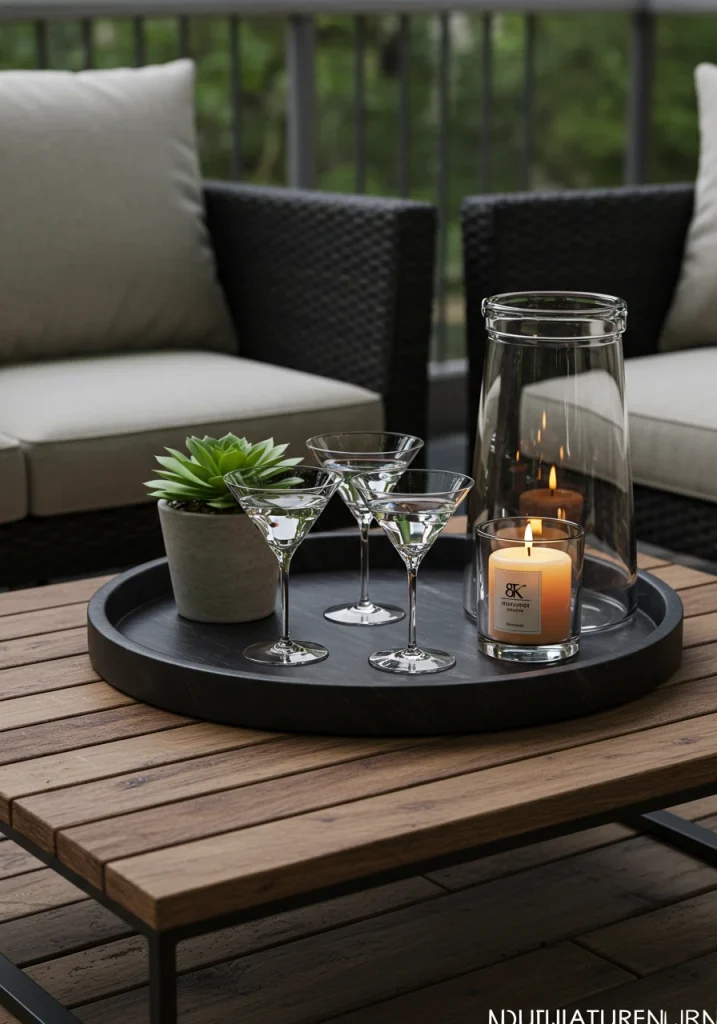 A beautiful, large, waterproof tray on your coffee table is perfect for corralling a few candles and a small plant. A set of stylish, unbreakable acrylic glasses is a must for entertaining. A piece of art designed for the outdoors—like a metal sculpture, a ceramic wall hanging, or a framed print on a waterproof canvas—can be a stunning focal point. I love to find unique, sculptural objects that can add an artistic touch to a tabletop or a shelf.